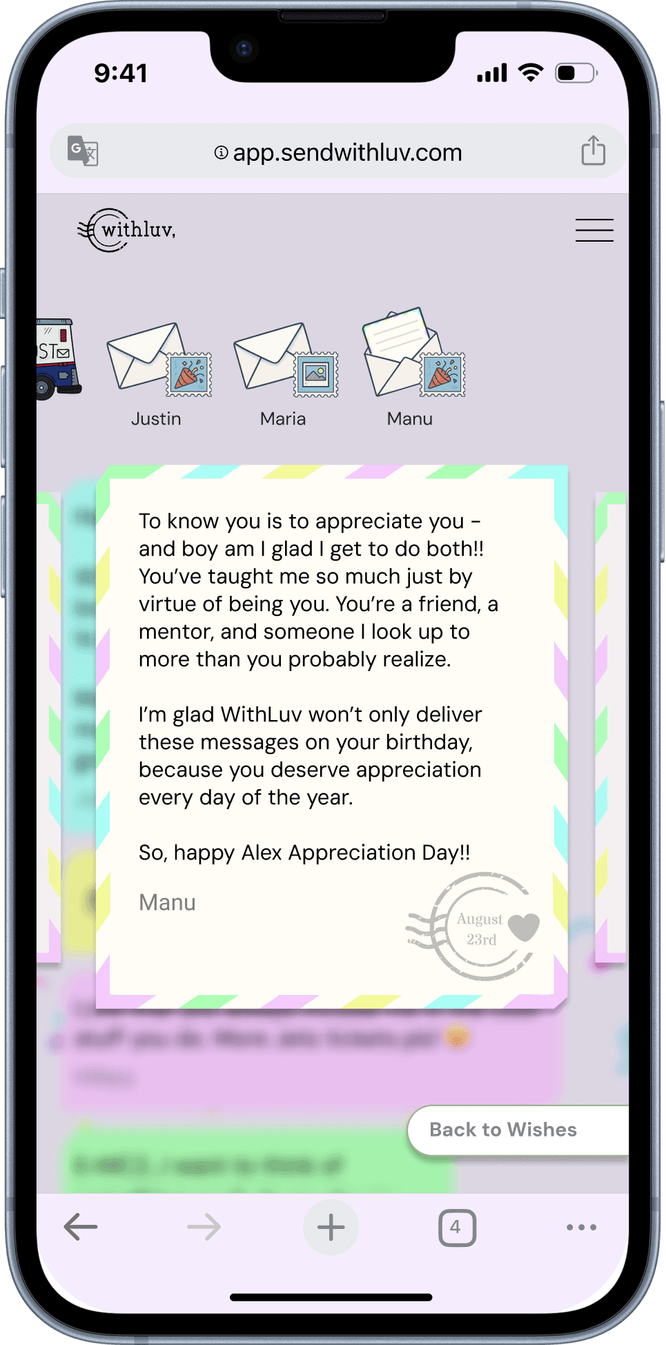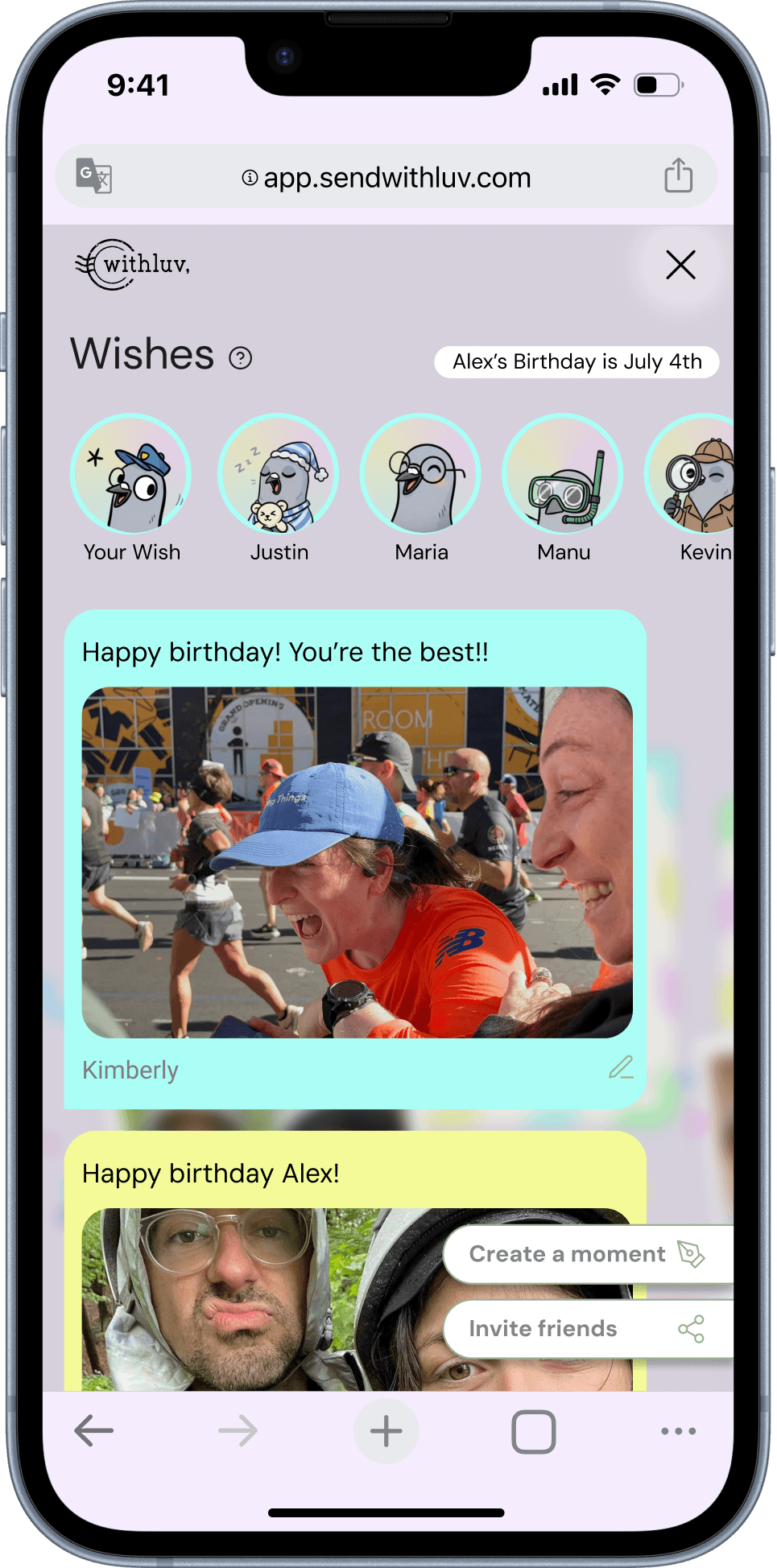 WithLuv is a new ritual for old emotions. A chance to celebrate someone not with likes or quick texts, but with something more meaningful. Start off with wishes on the celebration day, but make their year shine with meaningful moments delivered over time.